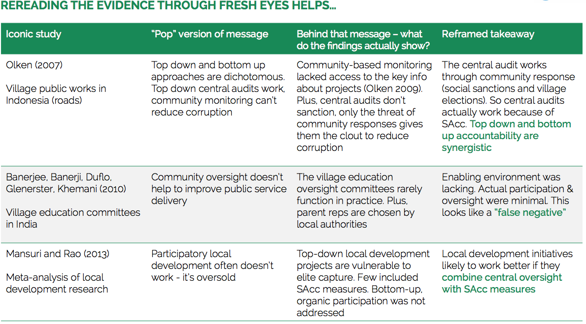 Second, this work makes an important re-reading of some of the literature that has found “mixed effects”, reminding us that when it comes to citizen engagement, the devil is in the details. For instance, in a number of studies that seem to say that participation does not work, when you look closer you will not be surprised that they do not work. And many times the problem is precisely the fact that there is no participation whatsoever. False negatives, as eloquently put by Jonathan.